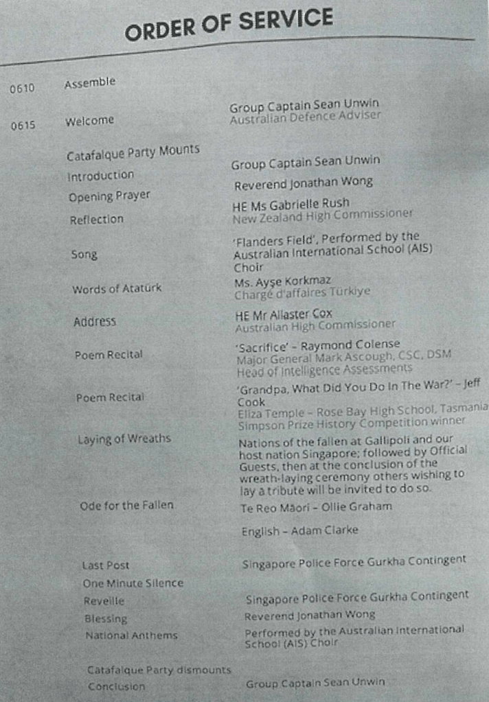 Two of my brothers, John and Bill Blyth, and their wives attended the ANZAC Day commemorations at Kranji War Cemetery in Singapore. John commented on how well the service was organised, with dignitaries from far and wide attending.